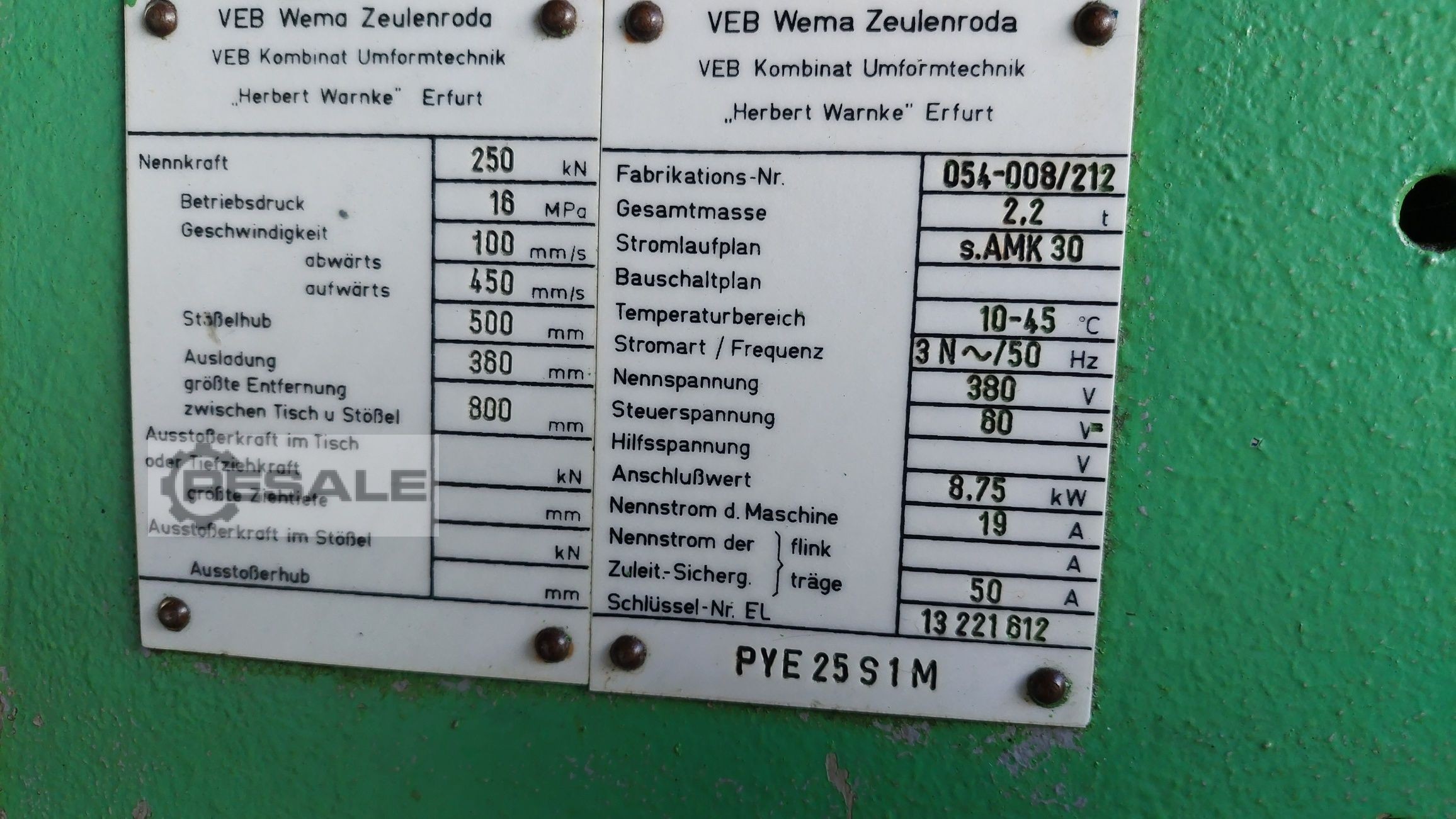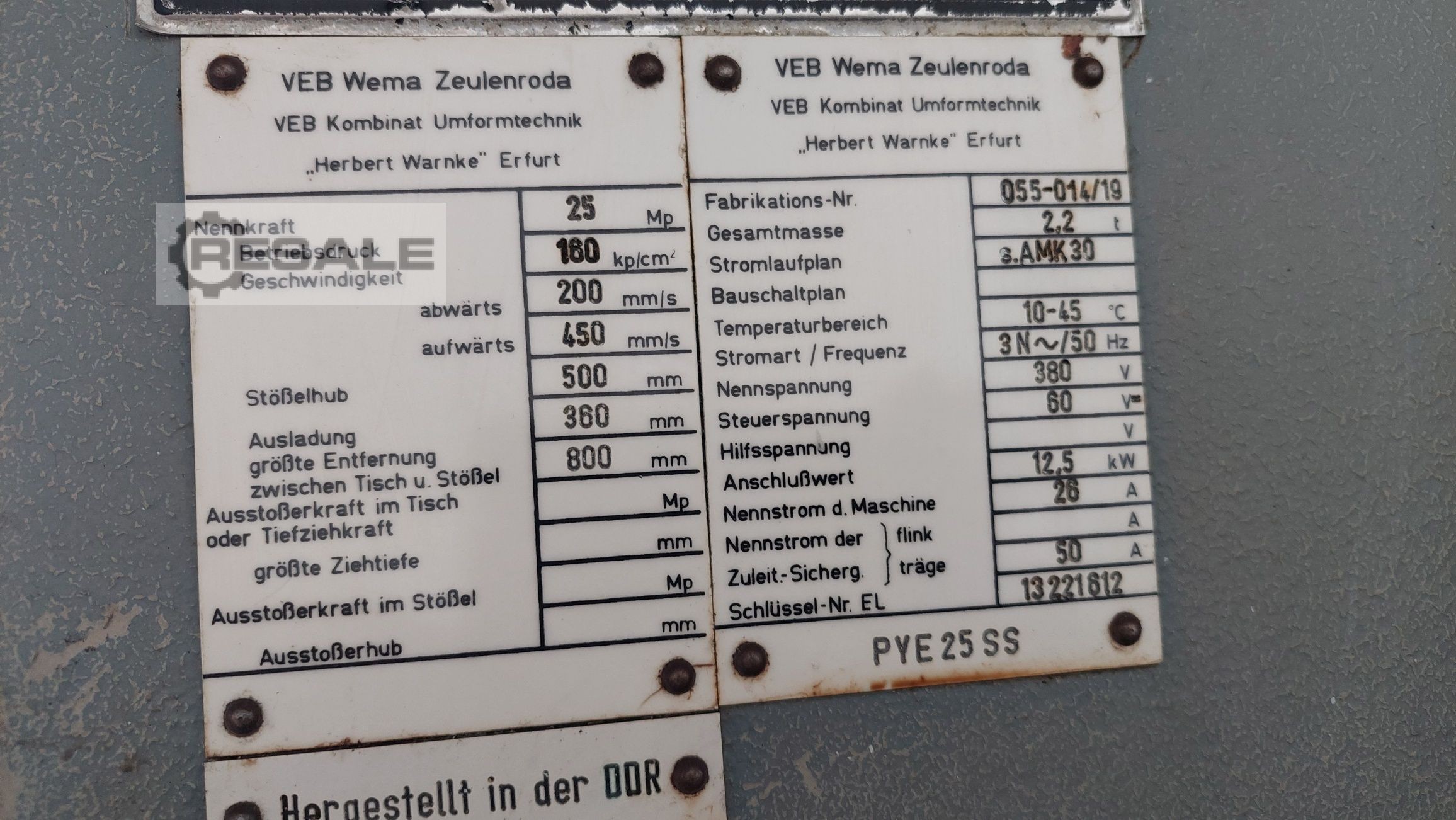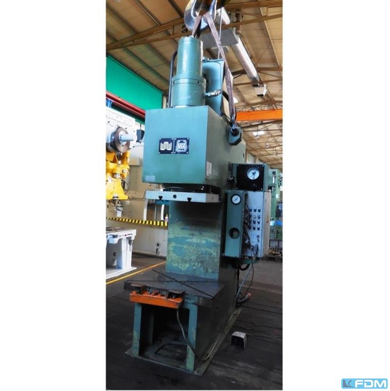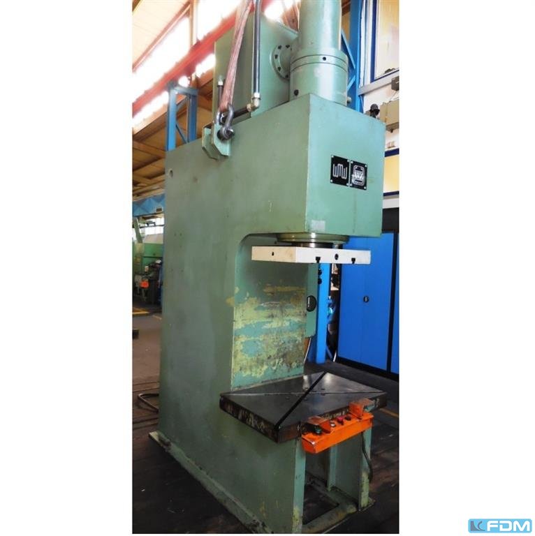 Offer 25272 Technical data: - Max. pressing force 25 t - Max. ram stroke 500 mm - Lifting speed 0 - 2.4 m/min - Return 0 - 12 m/min - Installation height 800 mm - Projection to the middle of the ram 360 mm - Pusher clamping surface 440 x 360 mm - Plunger clamping pin 40 mm - Table size 630 x 500 mm - Table bore / breakthrough 180 mm - E. footswitch - 2 hand control panel - Drive 400 V / 8.75 kW - Space requirement approx. W 800 x H 2750 x D 1150 mm - Weight approx. 2000 kg
